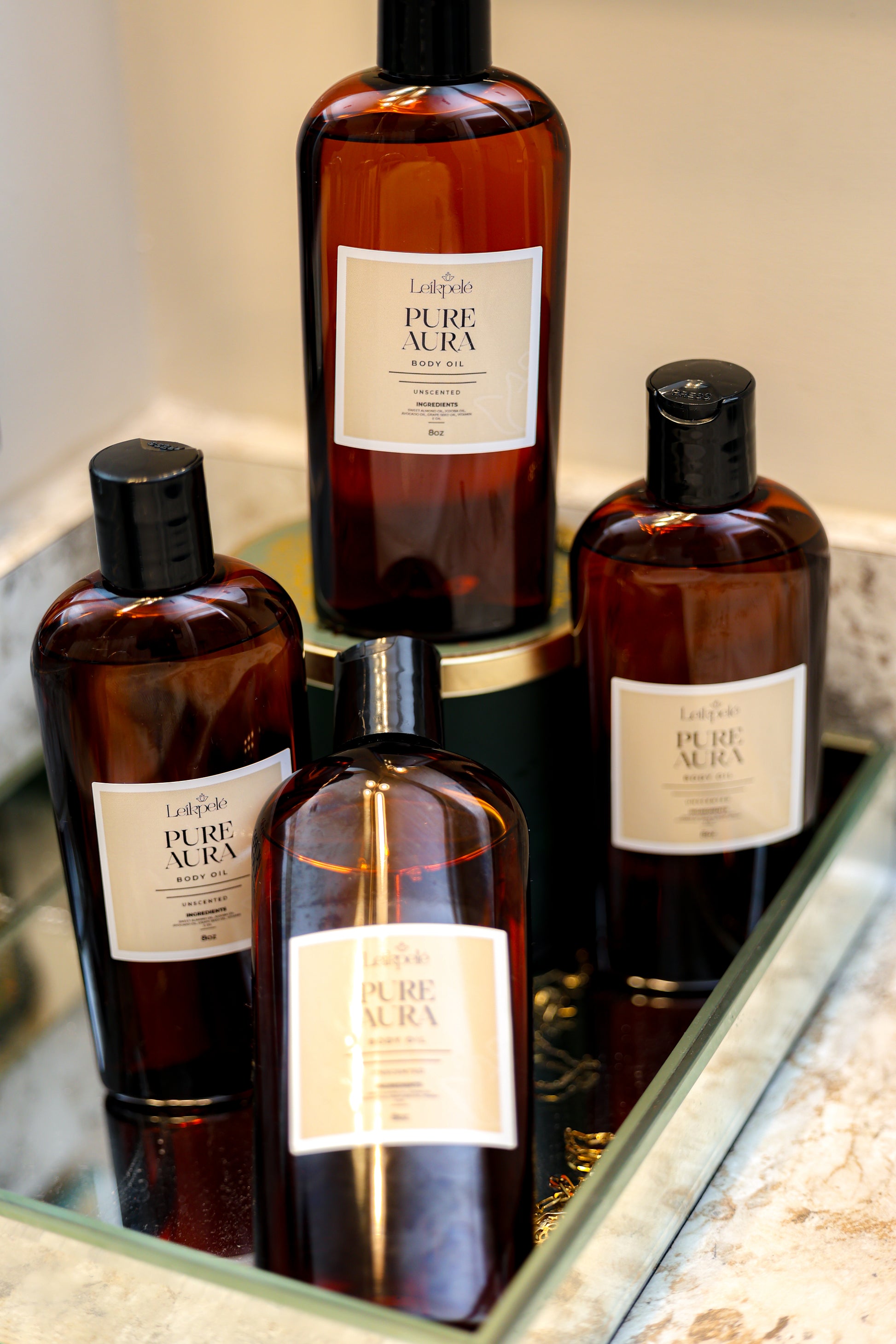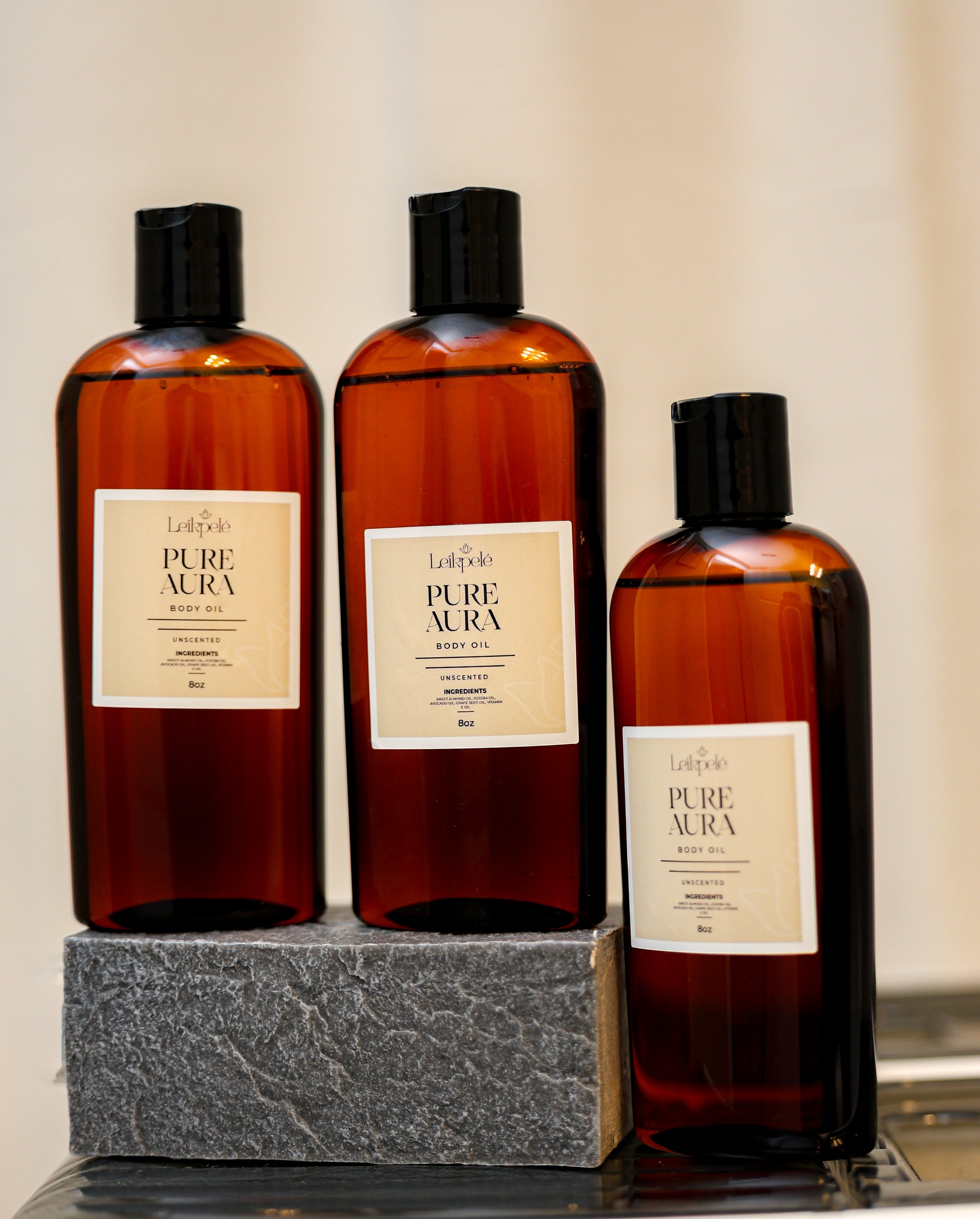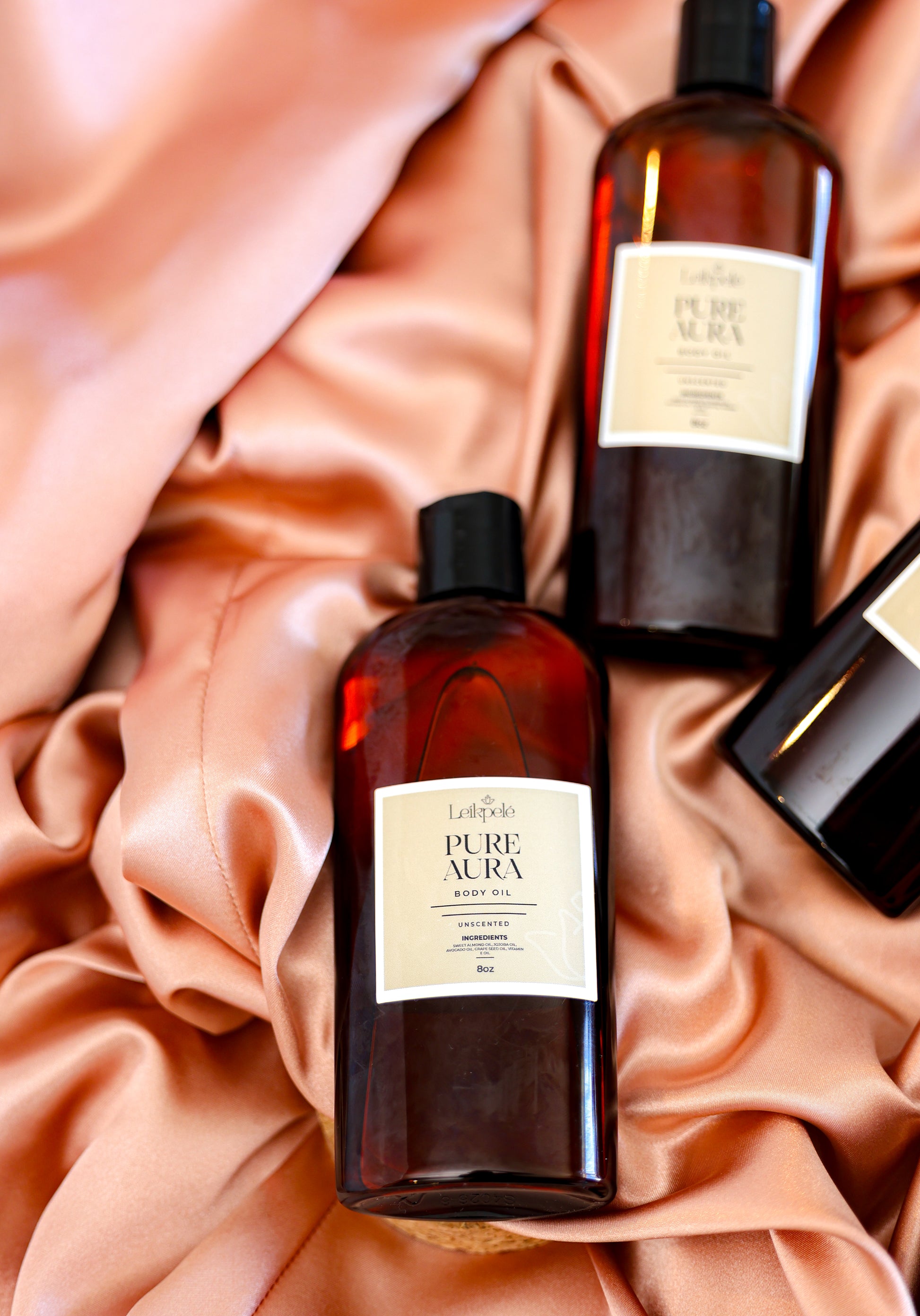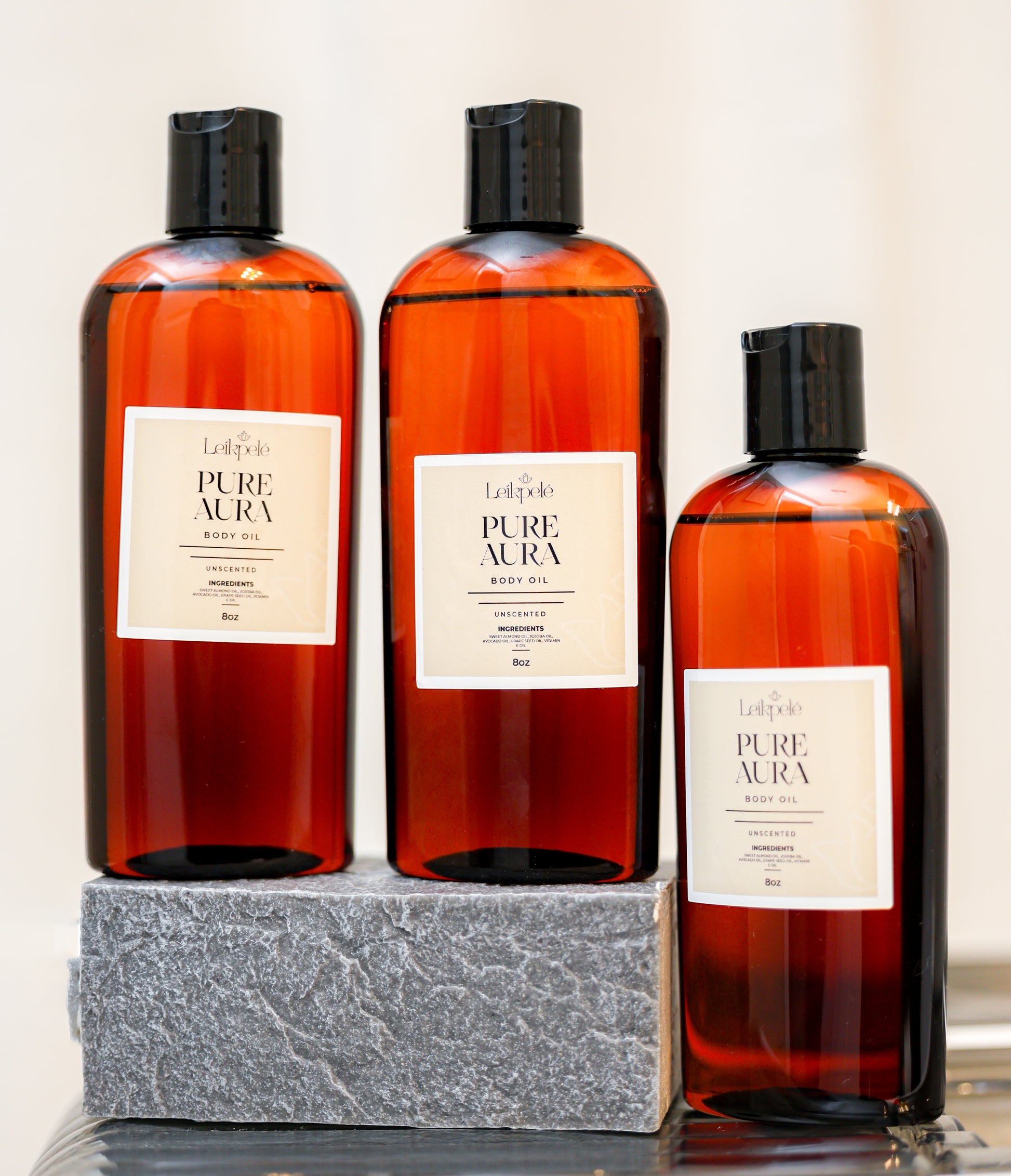 Pure Aura, our unscented body oil crafted with care to provide the perfect blend of nourishment without any added fragrance. This exquisite formula features five premium carrier oils, making it an ideal choice for individuals with fragrance sensitivities or for those who seek the pure and nourishing benefits of our oils without any accompanying scents. Immerse yourself in the luxurious simplicity of Pure Aura, where the focus is on pampering your skin with the finest ingredients, free from additional fragrances.
